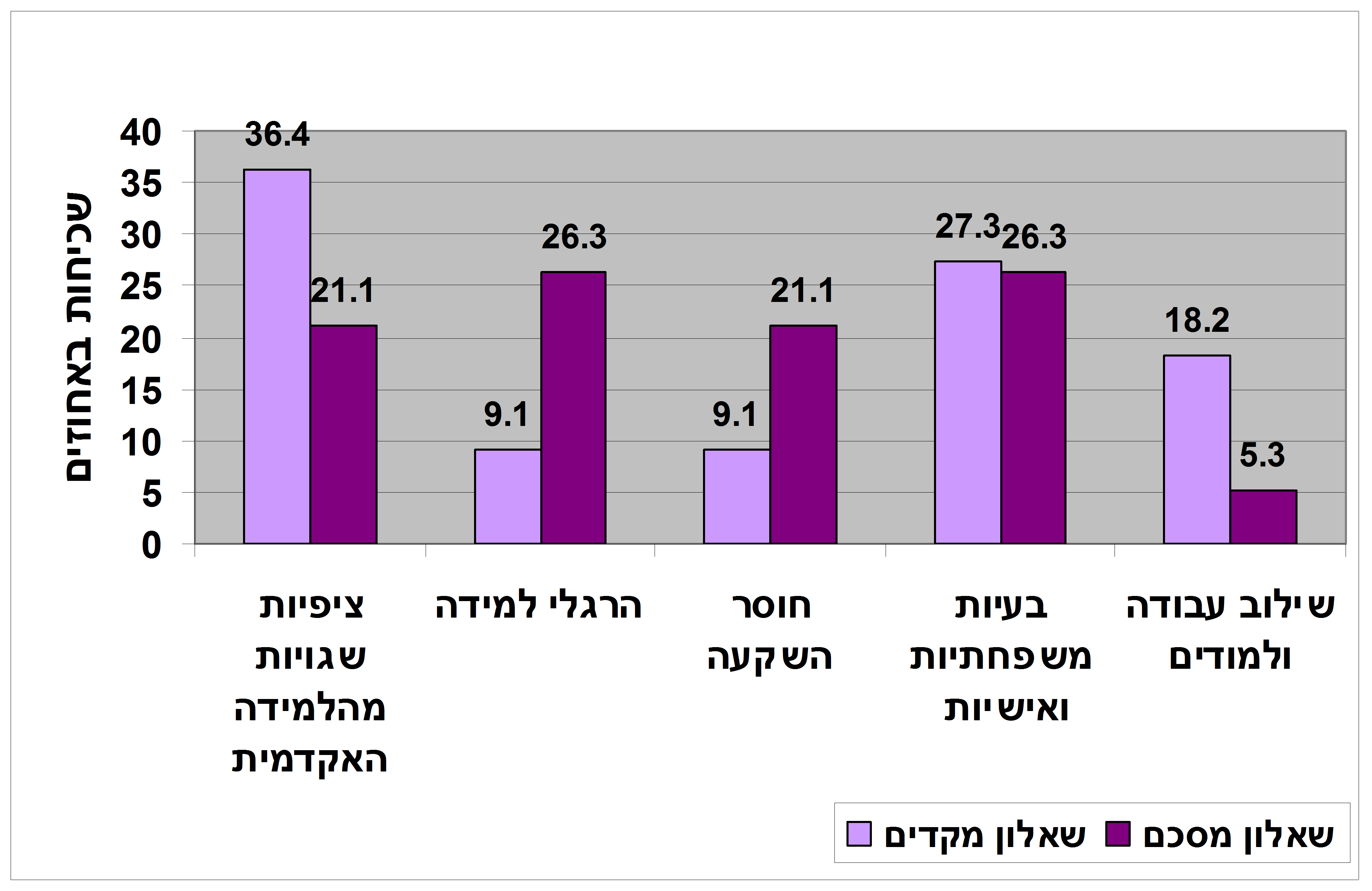 שאלה זו נבדקה בתחילת תהליך האימון ובסופו. תשובות המתאמנים נבדקו וחולקו לחמש קטגוריות: ציפיות שגויות מהלמידה האקדמית, הרגלי למידה לקויים, חוסר השקעה, בעיות משפחתיות ואישיות, ושילוב עבודה עם לימודים. שכיחויות הממצאים מוצגות בגרף 1.