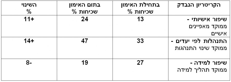 נערכה השוואה של שכיחות התשובות לפי קטגוריות אלו בתום האימון לעומת תחילתו.